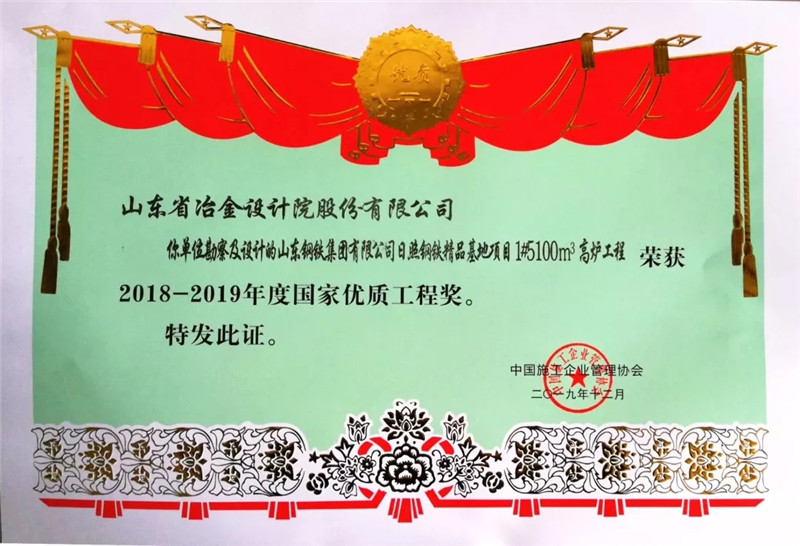 128日,2018-2019年度國(guó)家優(yōu)質(zhì)工程獎(jiǎng)總結(jié)表彰大會(huì)在國(guó)家會(huì)議中心舉行,由山冶設(shè)計(jì)總體規(guī)劃、自主設(shè)計(jì)并采取“EPC”總承包模式建成的山鋼集團(tuán)日照精品基地1#5100m3高爐工程喜獲國(guó)家優(yōu)質(zhì)工程獎(jiǎng)。