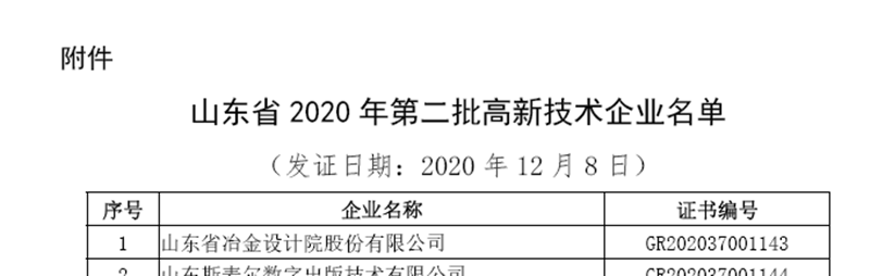 1月15日,根據(jù)全國高新技術(shù)企業(yè)認(rèn)定管理工作領(lǐng)導(dǎo)小組辦公室印發(fā)的《關(guān)于山東省2020年第二批高新技術(shù)企業(yè)備案的復(fù)函》,公司順利通過了2020年度國家高新技術(shù)企業(yè)認(rèn)定。