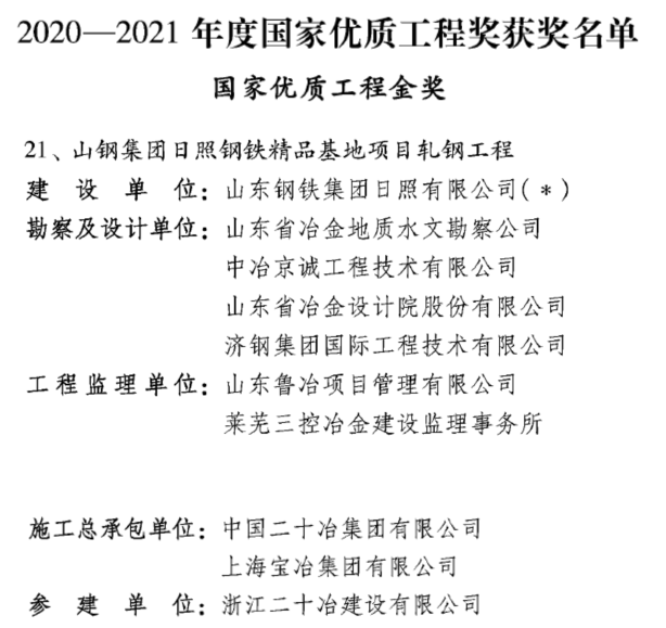 我公司承擔設計的山鋼日照2050mm熱連軋工程于近日獲2020-2021年度國家優質工程金獎。