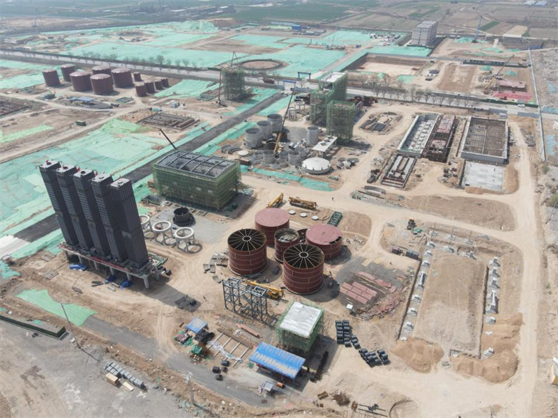 煤氣凈化區域的鼓風機站、蒸氨框架、脫氨廠房土建結構已經封頂,循環水泵房以及集水池已經完成澆筑,油庫區、焦油氨水分離區域的罐體逐步封頂,初冷器設備安裝完成,脫硫、終冷洗苯以及電捕等主要設備的安裝以及埋地管道的施工已在進行中。