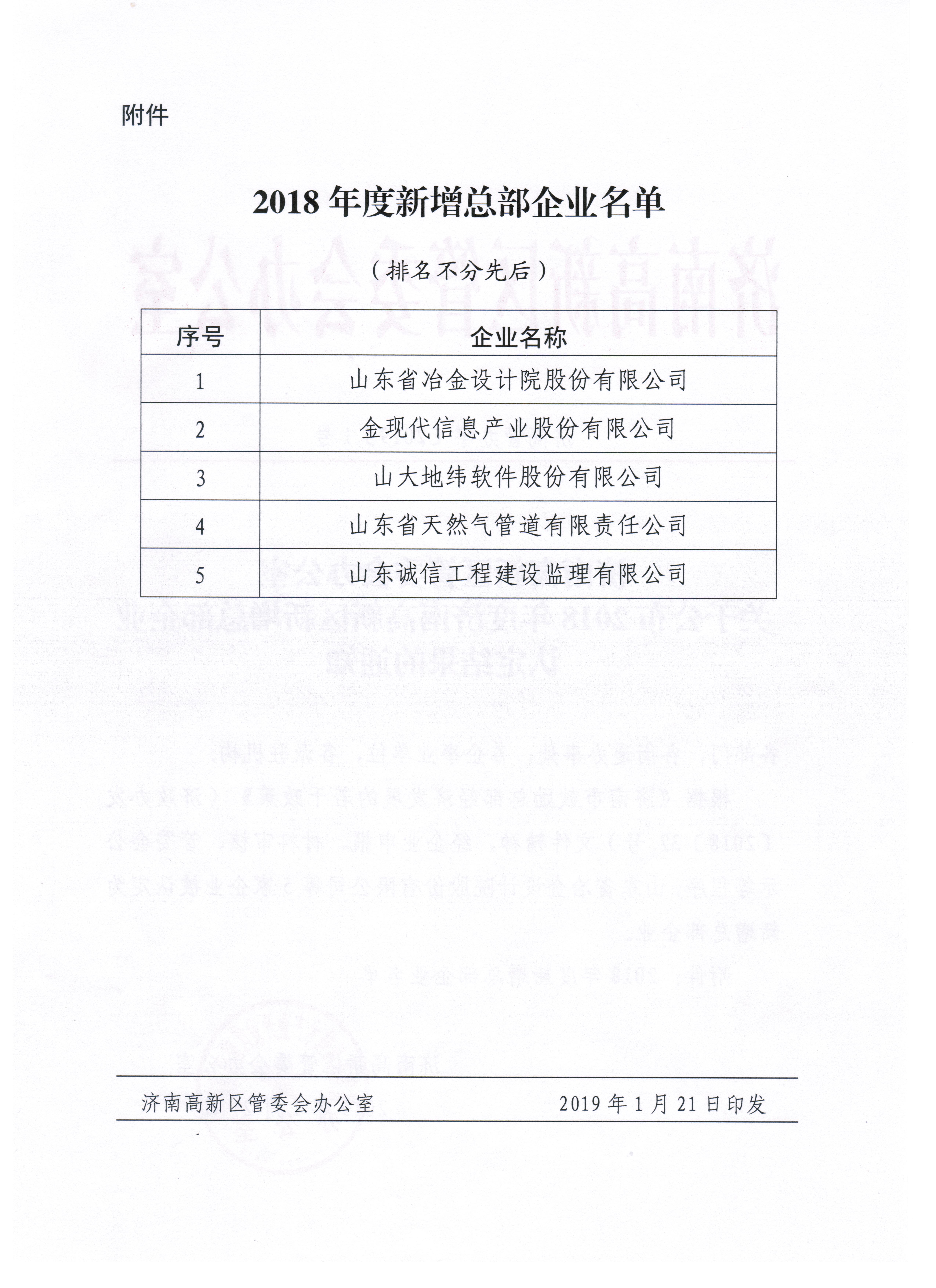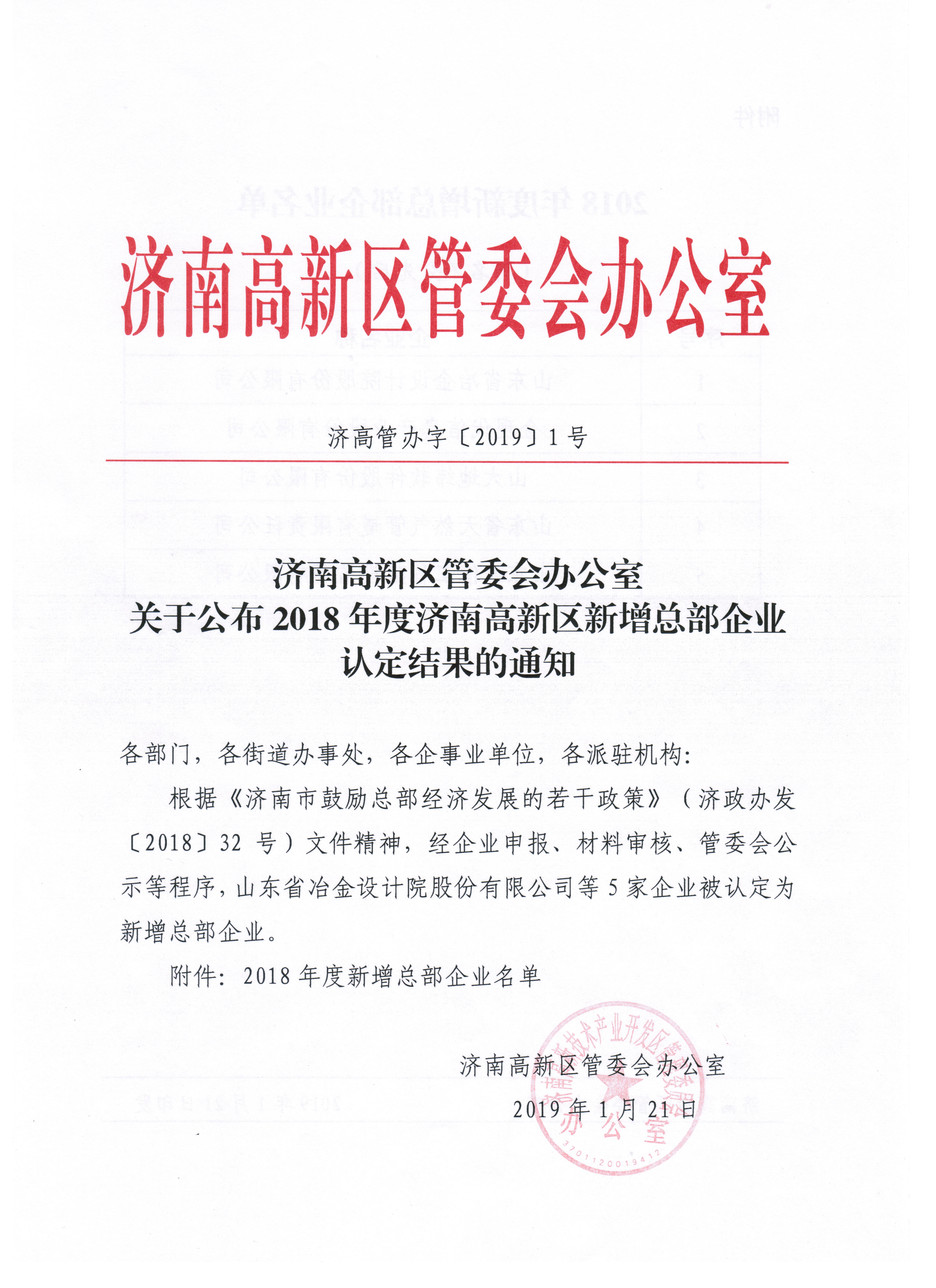 近日,山東省冶金設(shè)計院股份有限公司被濟(jì)南市認(rèn)定為首批“總部企業(yè)”。這標(biāo)志著我公司的綜合實力以及對地方發(fā)展的貢獻(xiàn)得到了濟(jì)南市政府的高度認(rèn)可。